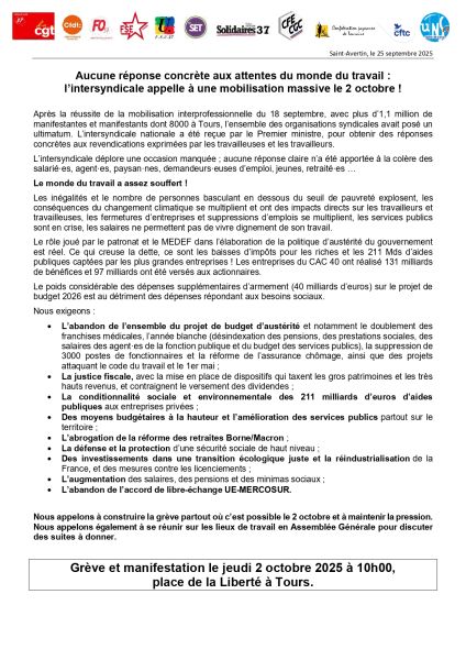 Appel à manifestation intersyndicale - Jeudi 2 octobre 10h Place de la Liberté à Tours